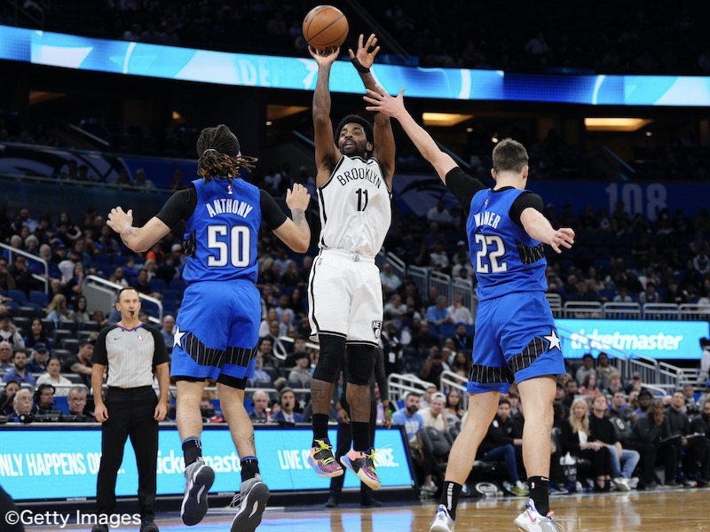 ORLANDO, FLORIDA - MARCH 15: Kyrie Irving #11 of the Brooklyn Nets shoots the ball against the Orlando Magic in the first half at Amway Center on March 15, 2022 in Orlando, Florida. NOTE TO USER: User expressly acknowledges and agrees that, by downloading and or using this photograph, User is consenting to the terms and conditions of the Getty Images License Agreement. (Photo by Mark Brown/Getty Images)