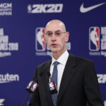 NBAのアダム・シルバーコミッショナー(右)は開催発表の記者会見で「日本のファンの皆さんにもう一度このプレシーズンゲームをお届けすることができ、非常に興奮しています。日本におけるNBAの人気は高く、バスケットボールをさらに発展させるための三木谷社長と楽天による継続的なご尽力に感謝しています」とコメントを寄せた [写真]=楽天/NBA