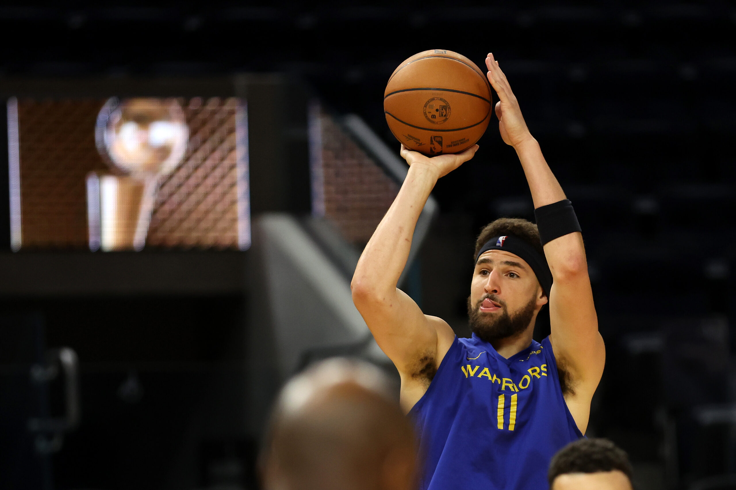 SAN FRANCISCO, CALIFORNIA - JUNE 01: Klay Thompson #11 of the Golden State Warriors warms up during media day prior to the start of the NBA Finals at Chase Center on June 01, 2022 in San Francisco, California. The Golden State Warriors will play the Boston Celtics in Game 1 of the NBA Finals on June 2, 2022. NOTE TO USER: User expressly acknowledges and agrees that, by downloading and/or using this photograph, User is consenting to the terms and conditions of the Getty Images License Agreement. (Photo by Ezra Shaw/Getty Images)