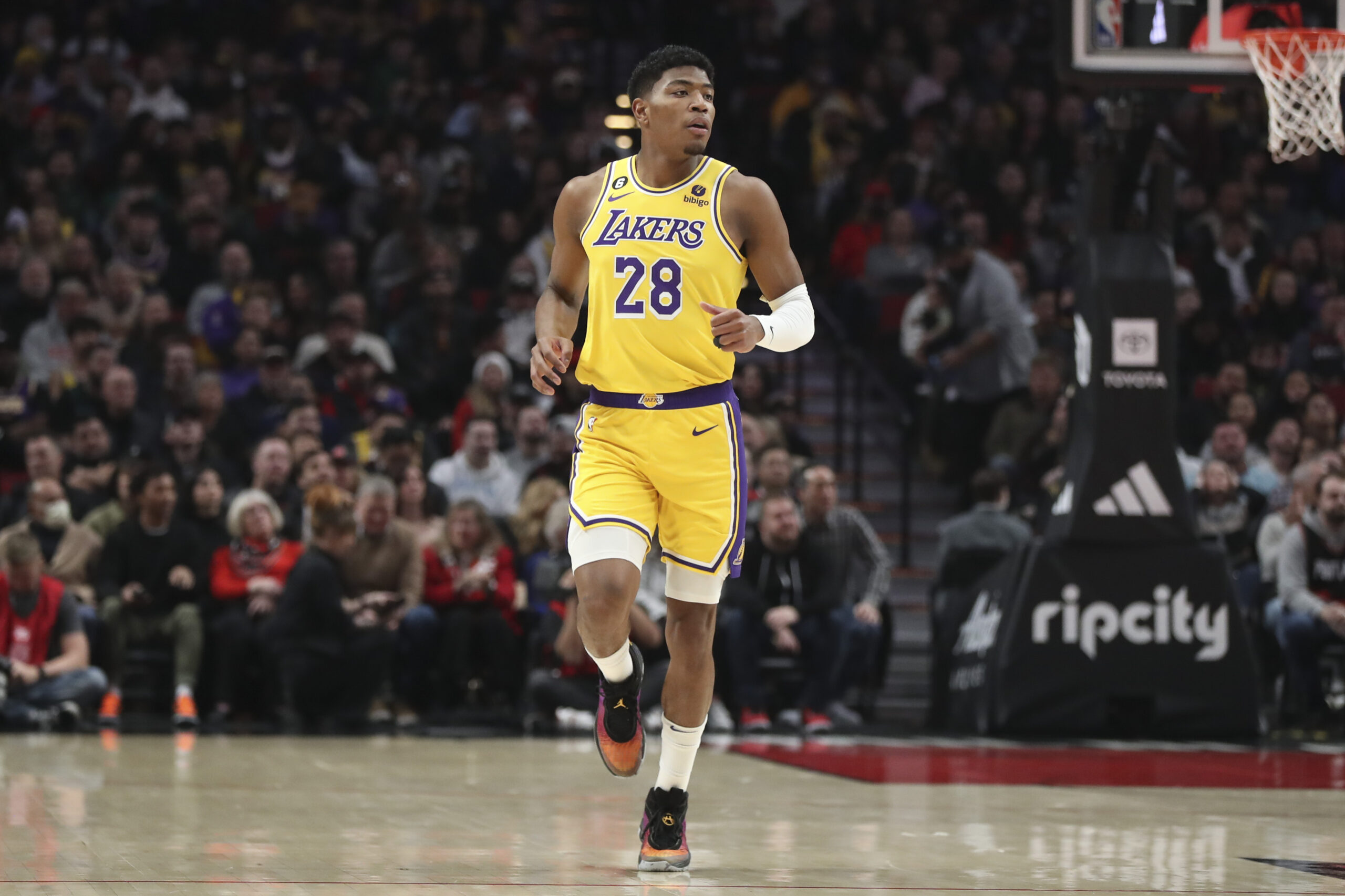PORTLAND, OREGON - FEBRUARY 13: Rui Hachimura #28 of the Los Angeles Lakers plays against the Portland Trail Blazers during the first quarter at Moda Center on February 13, 2023 in Portland, Oregon. NOTE TO USER: User expressly acknowledges and agrees that, by downloading and or using this photograph, user is consenting to the terms and conditions of the Getty Images License Agreement. (Photo by Amanda Loman/Getty Images)