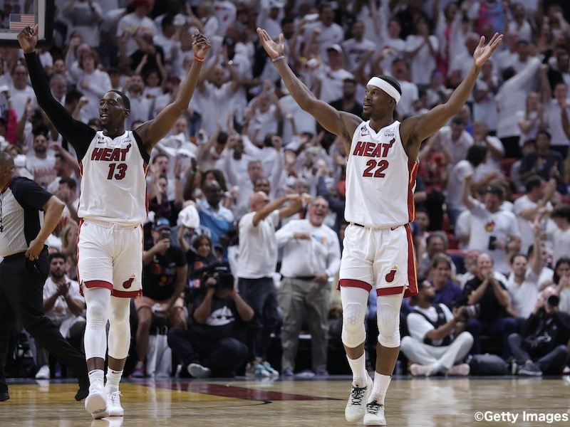 MIAMI, FLORIDA - MAY 21: Jimmy Butler #22 and Bam Adebayo #13 of the Miami Heat react during the third quarter against the Boston Celtics in game three of the Eastern Conference Finals at Kaseya Center on May 21, 2023 in Miami, Florida. NOTE TO USER: User expressly acknowledges and agrees that, by downloading and or using this photograph, User is consenting to the terms and conditions of the Getty Images License Agreement. (Photo by Megan Briggs/Getty Images)