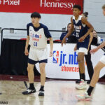 そして、この若手たちに続こうとしているU16の選手。9月17日から24日までカタールで行われるアジア大会に挑む12人の中で、7月に米ラスベガスで行われたJr.NBAショーケースに参加し、貴重な経験を積んだのが、四日市メリノール学院中学校3年生の中村颯斗(かいと)。アメリカを含めた世界17カ国から選ばれた男女40人の有望な中学生たちとの練習やイベント参加を経て、NBAサマーリーグが行われていた会場での試合ではスターター出場。身長201センチの選手を相手にドリブル突破、続くディフェンダーもフェイクを入れたドリブルで抜いて、見事なビハインド・ザ・バックハンドパスでアシストを決めたり、好ディフェンスを見せた。