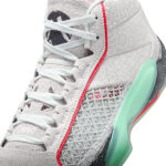 アッパーは、毛立ちの良いライトグレーのスエードアッパーを採用し、赤い縁取りがアクセントに。左右のシュータンはジャンプマンと八村のロゴがアシンメトリーで配置。細部にまでこだわり抜いた八村モデルの『エア ジョーダン 38』は、過去のPEにも負けじと劣らない日本人垂涎の仕上がりとなっている。