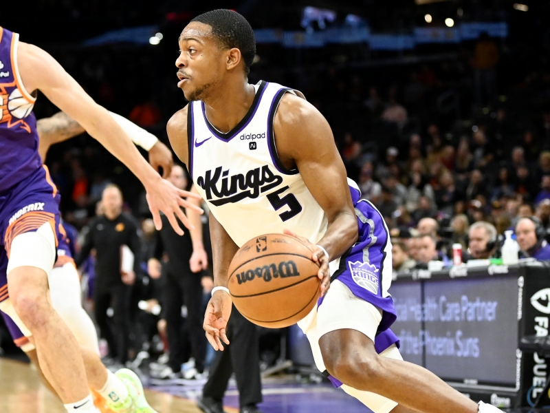 PHOENIX, ARIZONA - DECEMBER 08: De'Aaron Fox #5 of the Sacramento Kings drives to the basket against Drew Eubanks #14 of the Phoenix Suns during the first half of the NBA game at Footprint Center on December 08, 2023 in Phoenix, Arizona. NOTE TO USER: User expressly acknowledges and agrees that, by downloading and or using this photograph, User is consenting to the terms and conditions of the Getty Images License Agreement. (Photo by Kelsey Grant/Getty Images)