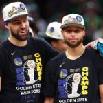 ウォリアーズで4度の優勝を達成したトンプソン(左)とカリー(右)[写真]=Getty Images