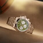 中央の針には『GA』のイニシャル、クロノグラフカウンターには精巧に組み込まれたバスケットボールのエンブレム、そして優勝によって伝説的な地位を築いた彼の所属チームのグッドランドグリーンを彷彿とさせるダイヤルの色合い。細部に至るまでアデトクンボの魅力が輝いている。いずれもリミテッドエディションで、GMTは1750本、クロノグラフは250本の限定生産だ。