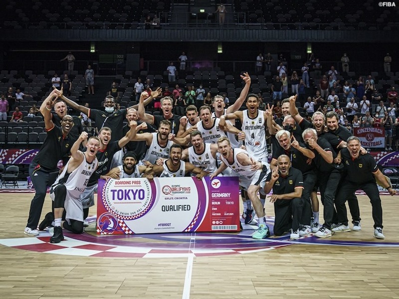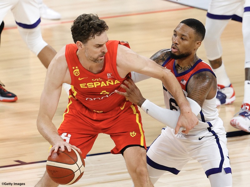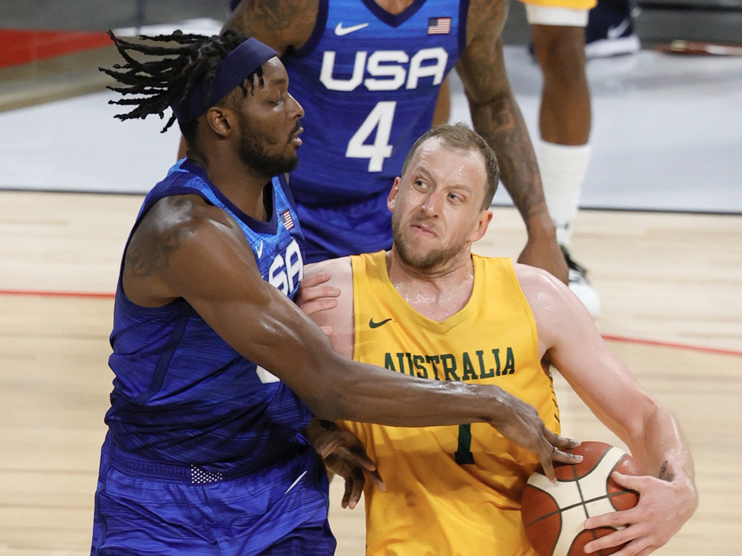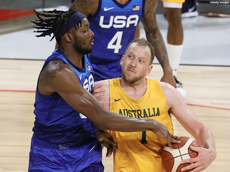 LAS VEGAS, NEVADA - JULY 12: Joe Ingles #7 of the Australia Boomers drives to the basket against Jerami Grant #9 of the United States during an exhibition game at Michelob Ultra Arena ahead of the Tokyo Olympic Games on July 12, 2021 in Las Vegas, Nevada. Australia defeated the United States 91-83. (Photo by Ethan Miller/Getty Images)